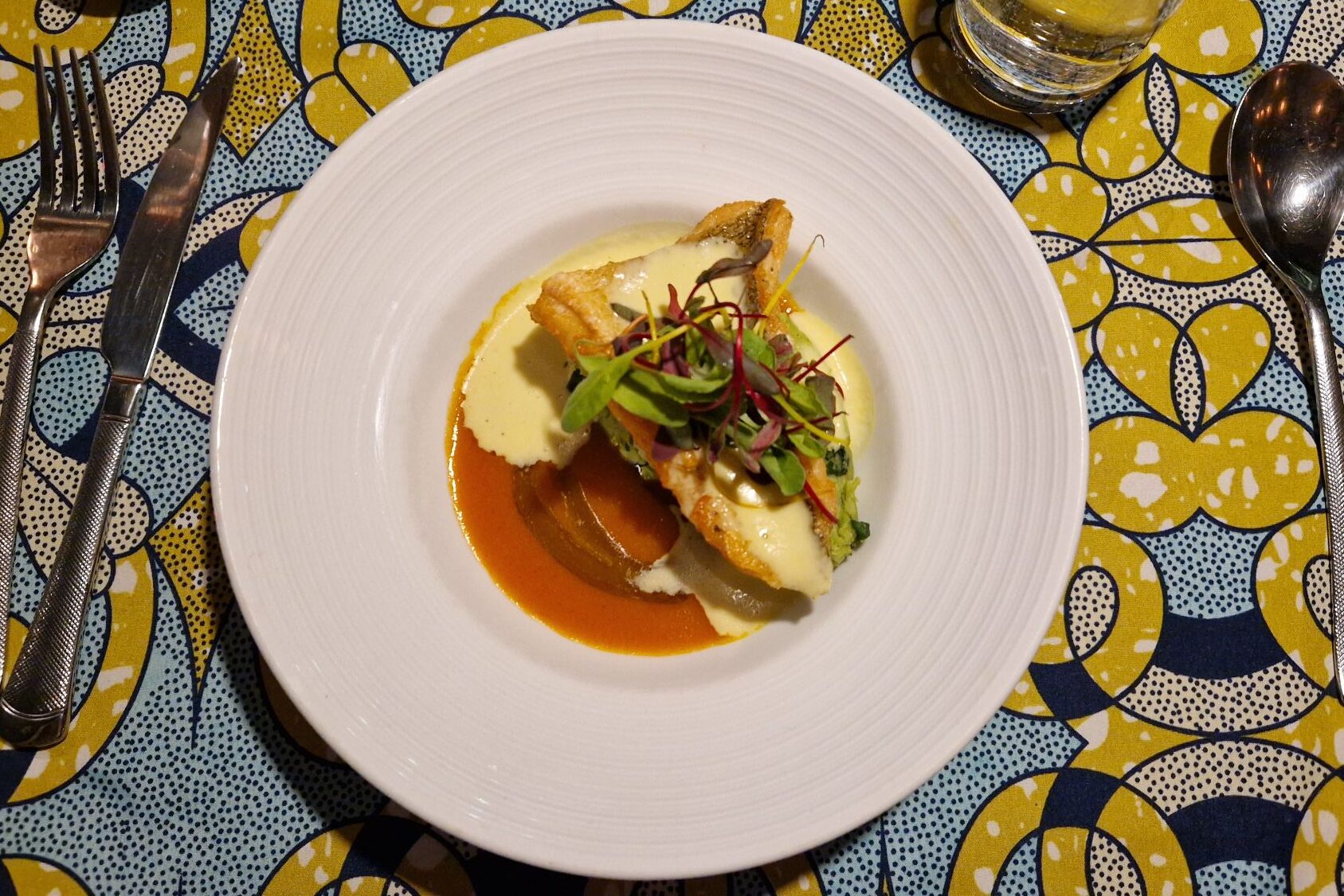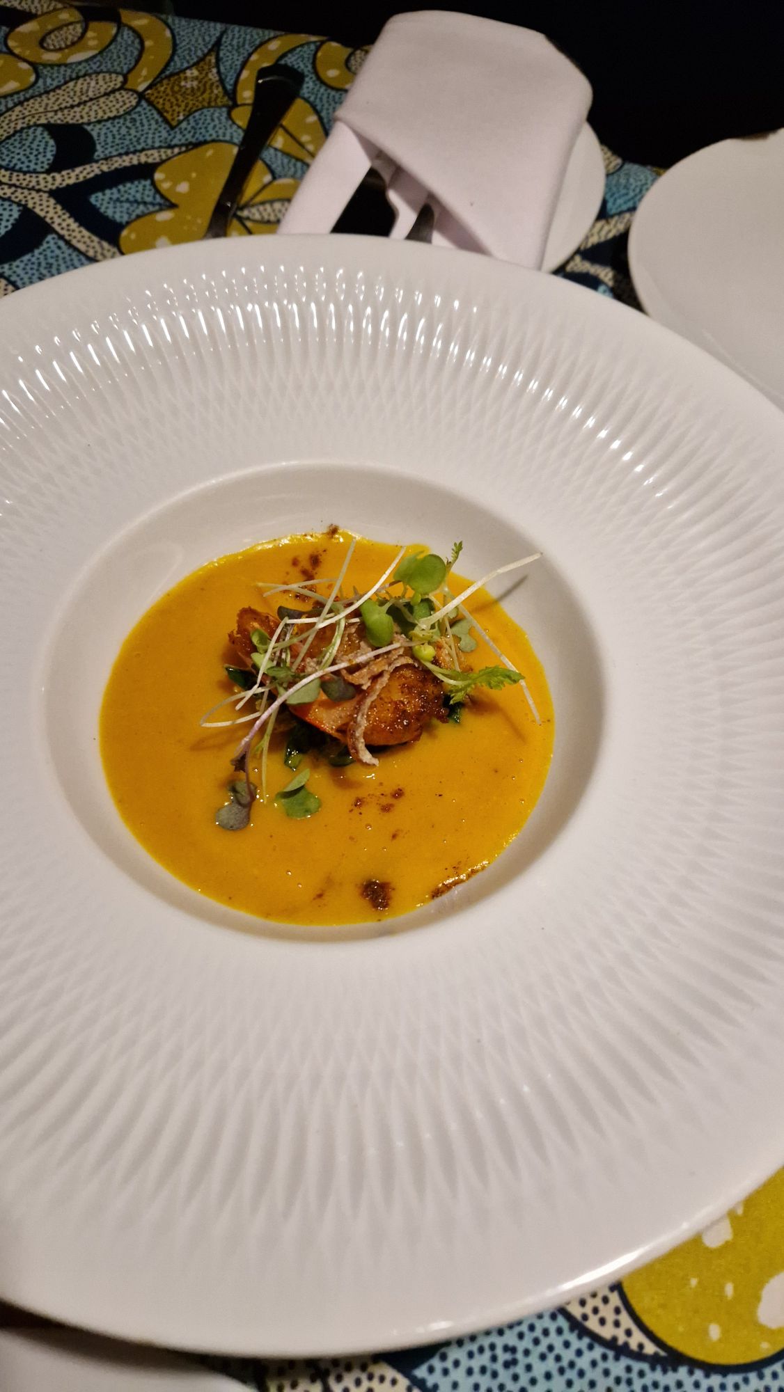Le repas débute avec le Mayombé, un velouté léger de patate douce. La texture est fluide et délicate. Une crevette simplement déposée sur le dessus apporte une touche iodée discrète. La surprise vient du mbika congolais, des graines de courge moulues typiques d’Afrique centrale qui ajoutent profondeur et caractère au plat. Le goût est fin, équilibré, mais l’ensemble reste relativement léger. Une mise en bouche élégante, mais qui aurait gagné en intensité ou en générosité.